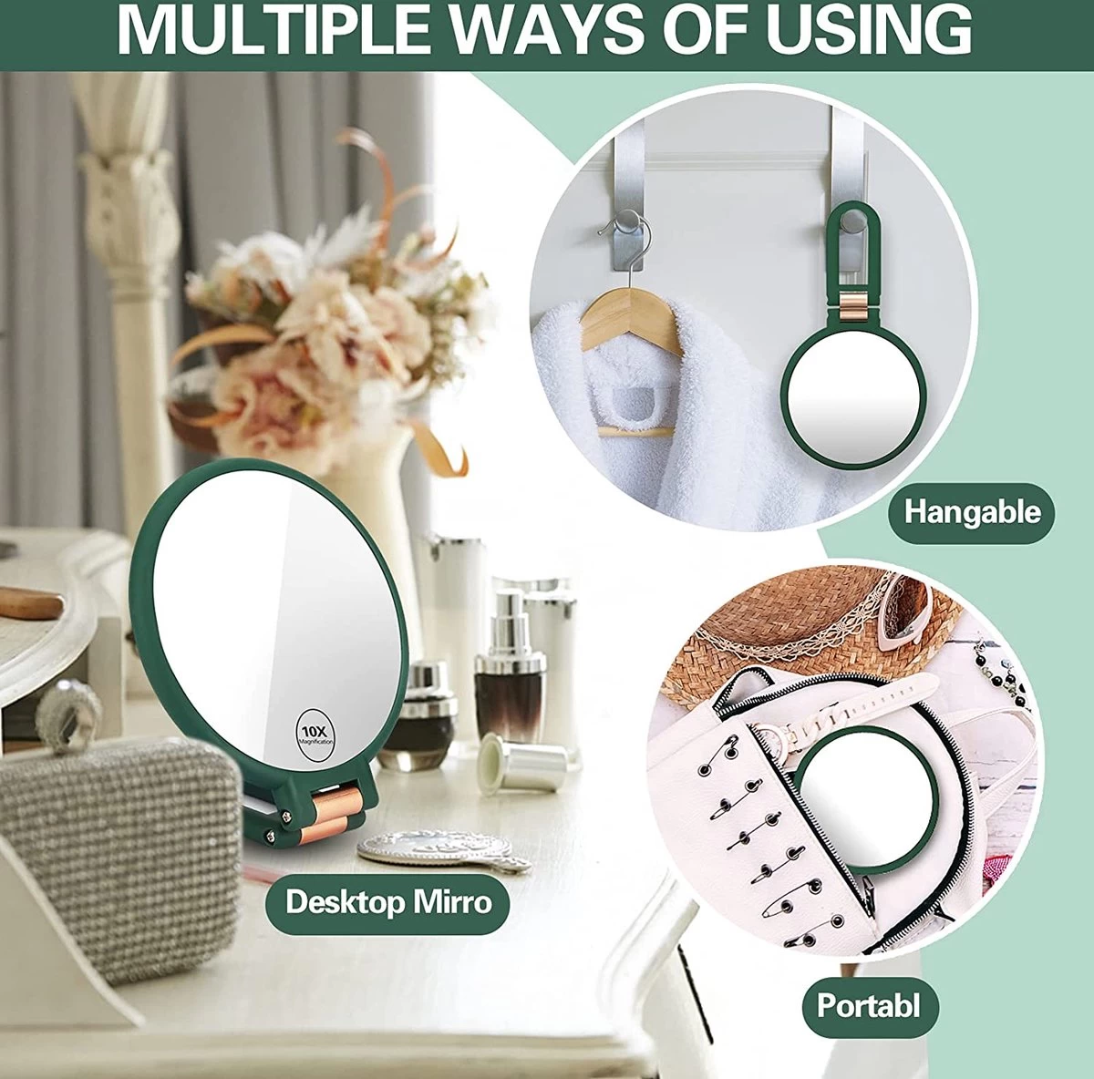 - 360 graden draaiend: deze handspiegel beschikt over een opvouwbare en flexibele handgreep, die in meerdere hoeken kan worden gedraaid. Daarom kan onze make-upspiegel als handspiegel, tafelspiegel en hangspiegel worden gebruikt om een perfecte positionering te garanderen.
