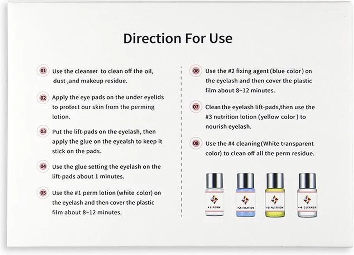 Op de achterkant van de doos staat een uitgebreide handleiding hoe je professioneel en efficiënt je eigen wimpers kunt zetten. De wimperkruller gaan 1 maand mee zonder dat je dagelijks uw wimperkruller hoeft te gebruiken. Volg de stappen hieronder voor een succesvolle wimperlift sessie.