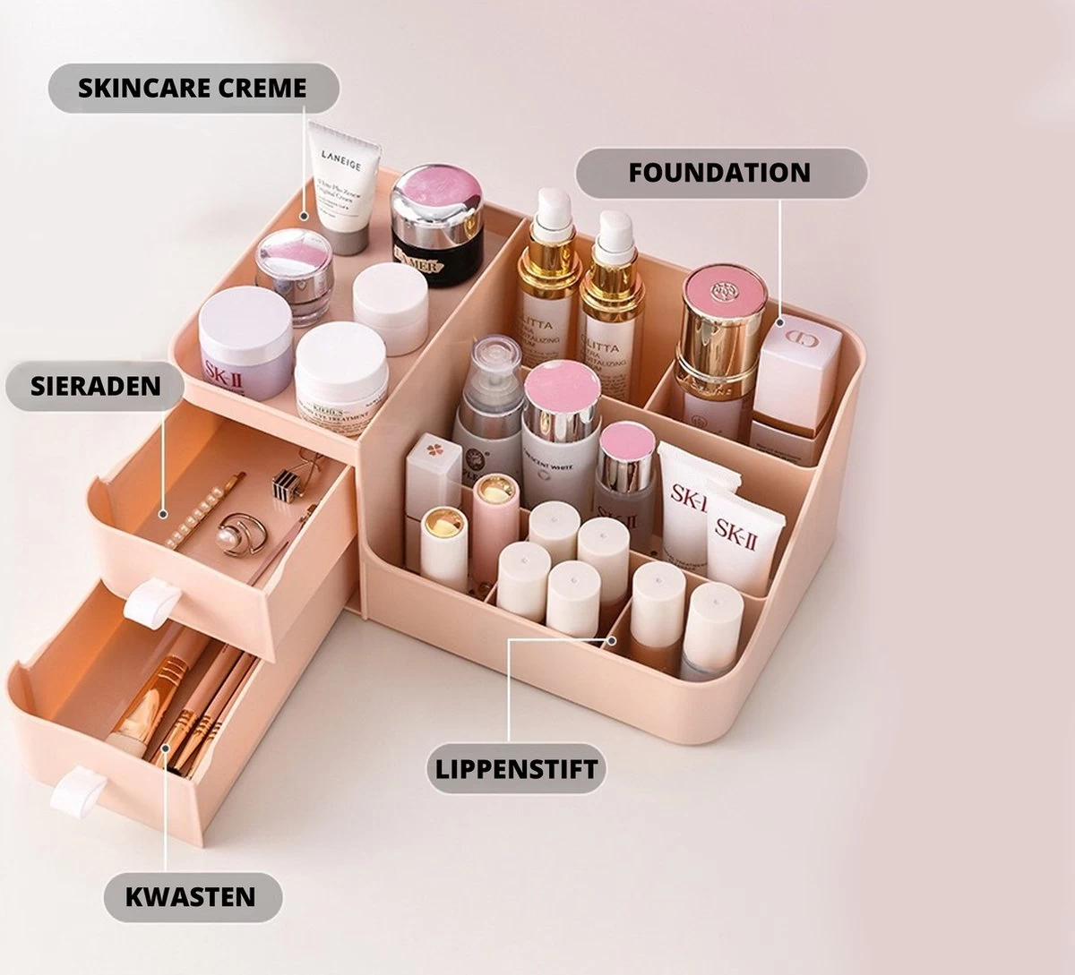 De organizer is voorzien van 2 lades en 7 verschillende opbergvakken, hierdoor kan je bijna altijd alle producten makkelijk en snel pakken en netjes opbergen, denk hierbij aan bijvoorbeeld: kwasten, lippenstift, mascara, ochtendcréme, lotion etc.