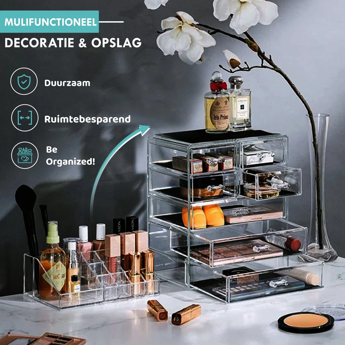 Vind gemakkelijk het product waar je naar op zoek bent. Door de transparante kleur zie je meteen waar het product ligt die jij zoekt. Je kan jouw producten per categorie indelen en door het transparante design makkelijk vinden. Je kan de make-up opberger ook gebruiken voor sieraden of andere producten!